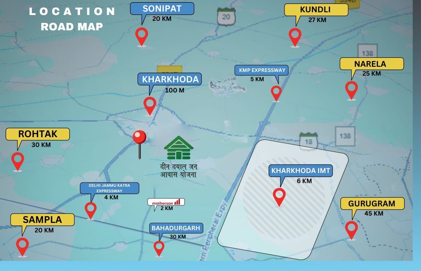 Deen Dayal Jan Awas Yojna (DDJAY) plots in Kharkhoda are premium residential opportunities offered under the Haryana Government’s affordable housing initiative. Strategically located near major highways and essential amenities, these plots promise a well-connected and thoughtfully developed living environment for families seeking quality homes at accessible prices. Situated close to the Delhi-Kundli-Manesar-Palwal (KMP) Expressway and easily accessible via major road networks, the DDJAY plots in Kharkhoda ensure seamless commuting to Delhi, Gurugram, and other surrounding cities. The prime location not only offers excellent road connectivity but is also near upcoming educational, healthcare, and recreational hubs, making it a preferred destination for modern living.
